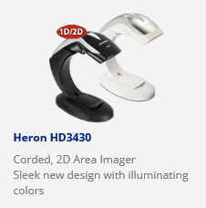The Heron Series offers a sleek new design with illuminating colors and custom sounds. The HD3100 corded scanner is a 1D linear imager. The HD3430 2D is a corded area imager capable of reading 1D, 2D, postal codes, stacked, composite codes and capturing images.